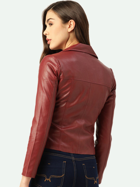 Red self design solid faux leather jacket with shoulder tabs, has a lapel collar, 2 pockets ,has a button closure, long sleeves, curved hemline, faux fur lining